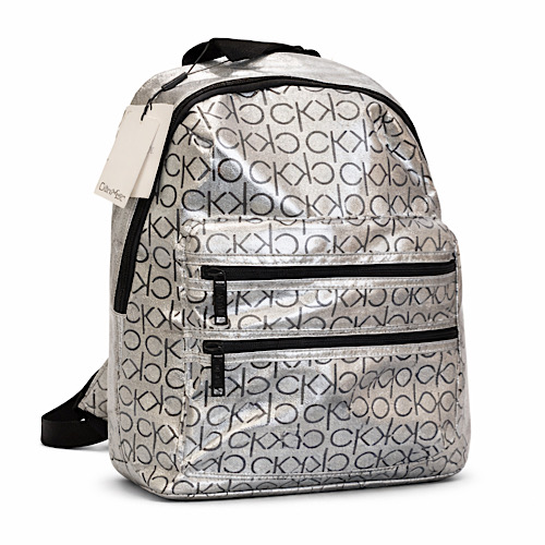 Mochila moderna con diseño monogram CK Original en tono plateado, amplia, liviana y perfecta para el día a día con un toque de estilo urbano.