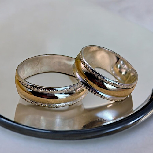 Alianzas bicolor de Plata 925 con franja central en Oro y delicado borde decorativo. Un diseño elegante y distinguido para una unión única.
