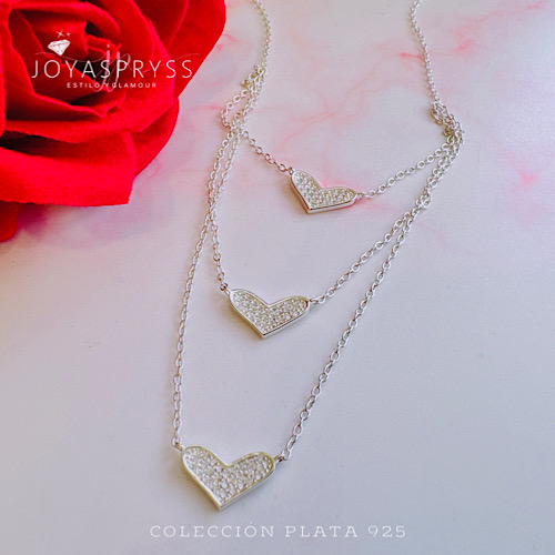 Delicado collar triple con tres corazones pavé en plata 925, un diseño luminoso que simboliza amor, unión y brillo eterno. Ideal para acompañar cualquier look.
