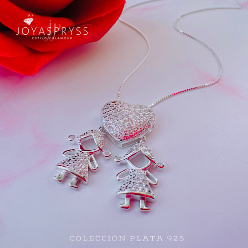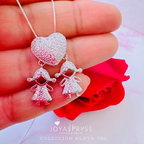 Collar en Plata 925 con un corazón pavé de brillo intenso y dos dijes de niñas con acabado luminoso que destacan al instante. Una pieza glam, elegante y con personalidad, ideal para quienes aman accesorios que capturan miradas y complementan cualquier look con un toque de lujo moderno.