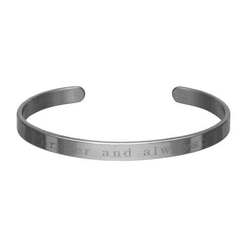 Una joya elegante y significativa. Esta esclava rígida, plateada, está diseñada para personalizar con el mensaje que desees: una fecha, un nombre o una frase que marque tu historia. Su acabado brillante y estilo minimalista la convierten en un accesorio versátil, perfecto para usar a diario o regalar en ocasiones especiales.