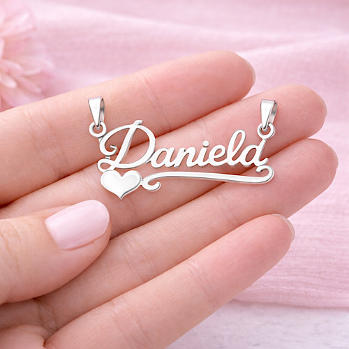 Delicado dije con nombre personalizado y detalle corazón Plata ley 925. Un diseño femenino y elegante que convierte tu nombre en una joya única.